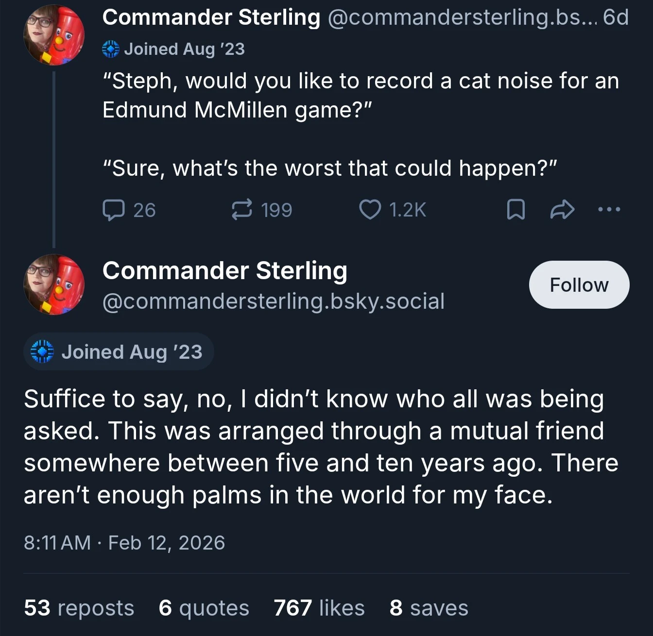 For me, it’s just such a small issue to focus on and ruin something else you find enjoyable. It’s one thing if McMillen was a vocal supporter of Israel or vocal MAGA. Like, I haven’t watched a Tom Cruise movie in almost 2 decades because of his role in Scientology, but I watch Zoolander like once a year.