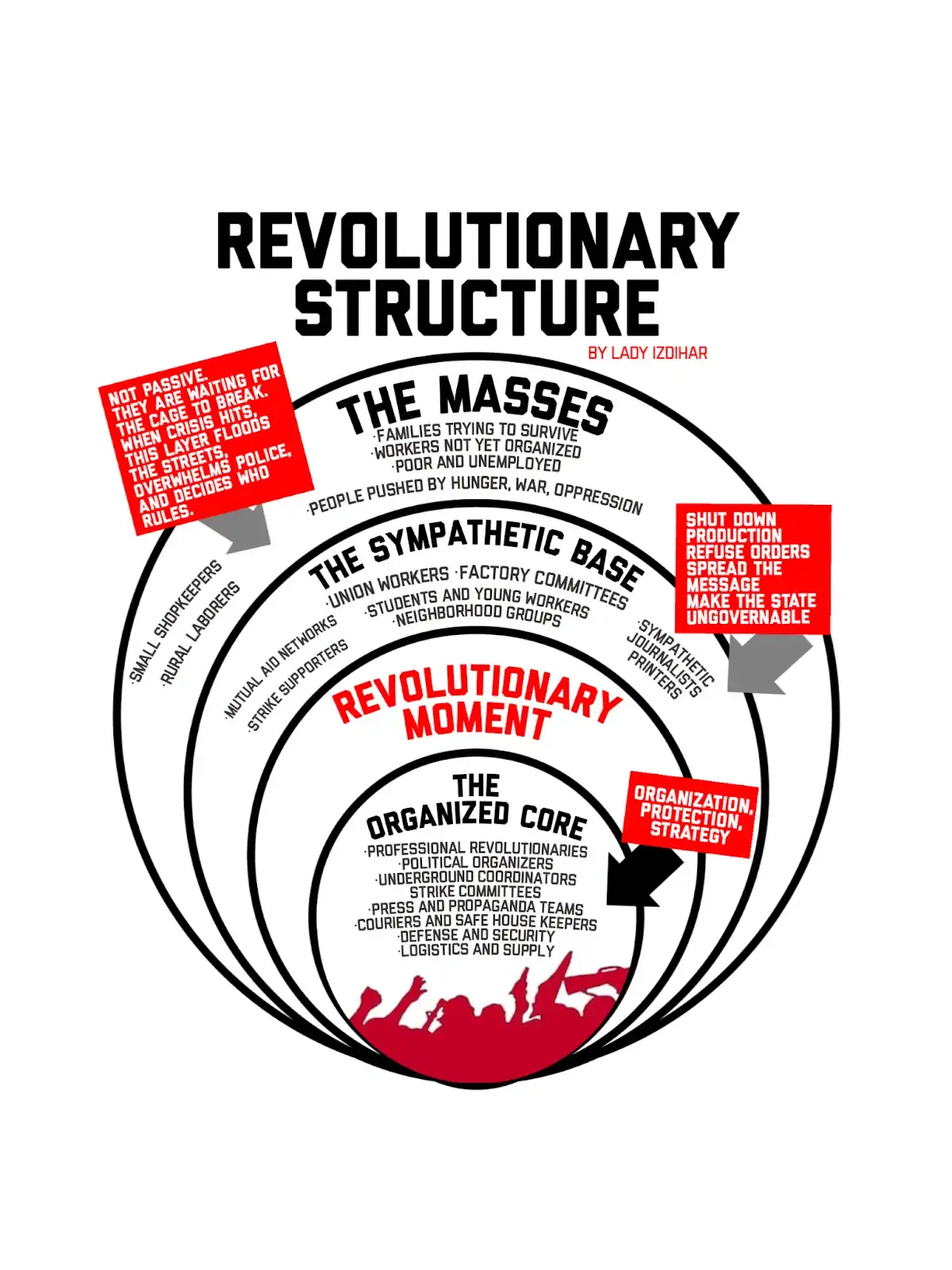 “Intellectuals,” or whatever term you wish to describe them as, are not a class, but a subsection of every class. Each class has its own “intellectuals,” there are proletarian intellectuals and there are capitalist intellectuals. What the vanguard is, is a group of the working classes dedicated to revolution, professional revolutionaries. They are not “elites.” Here’s a diagram from Lady Izdihar, with the “organized core” being the vanguard: