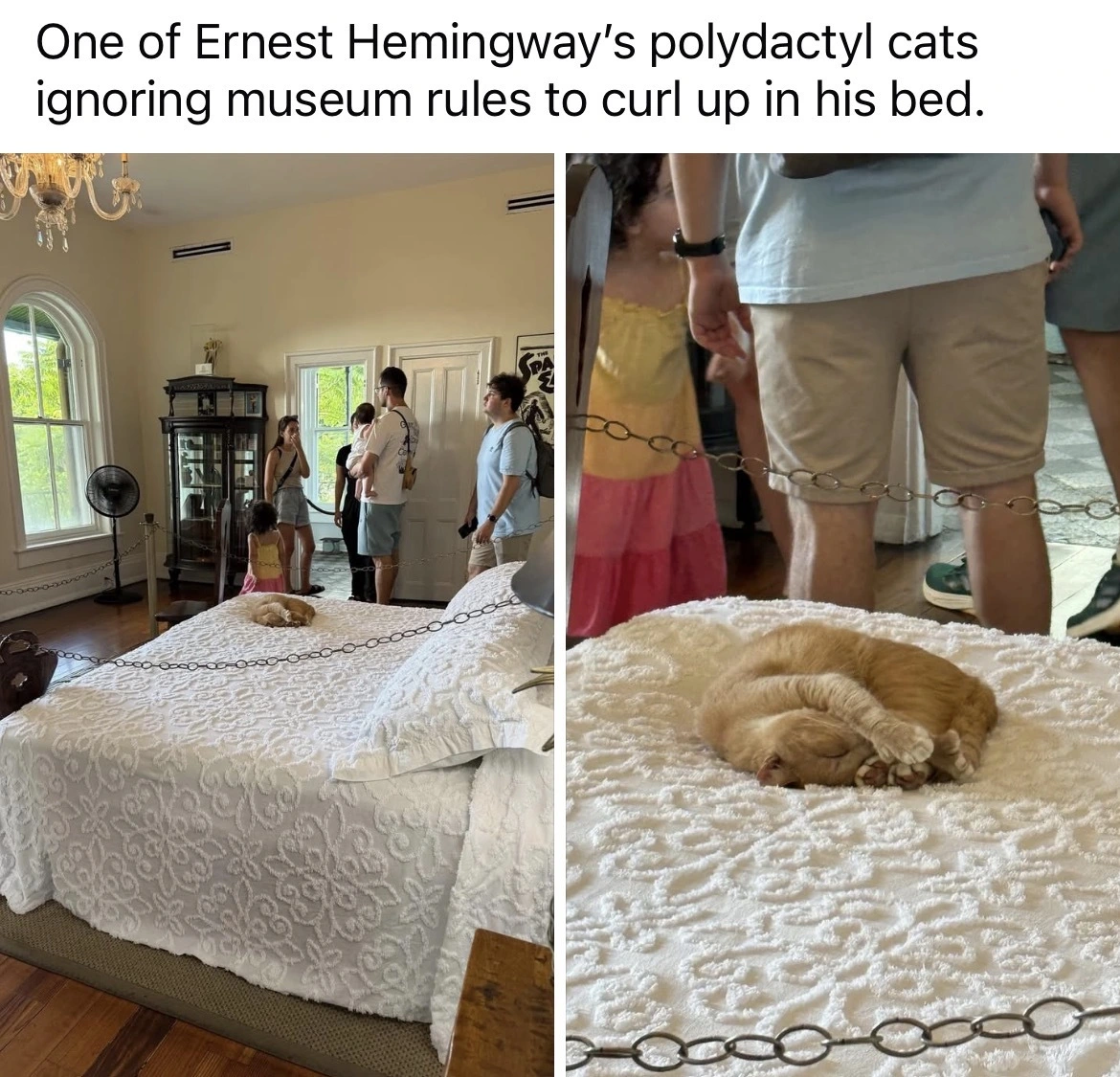 For those who are, like me, confused about how the cat could belong to a man who died an entire human lifetime ago: the museum houses descendants of Hemingway’s childhood cat (and a bunch of other cats too). The website has a page about them that includes pictures of a few https://www.hemingwayhome.com/our-cats