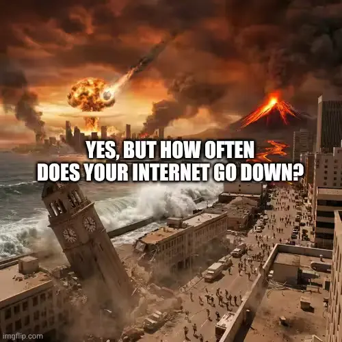 yes but how often does your internet go down? I agree with the sentiment and I hate this but we should think about this from an average user perspective when we make our argument. Internet doesnt go down, I’ve had more electricity outages than internet outages in the past 5 years. if you live in a city its a rare thing.
