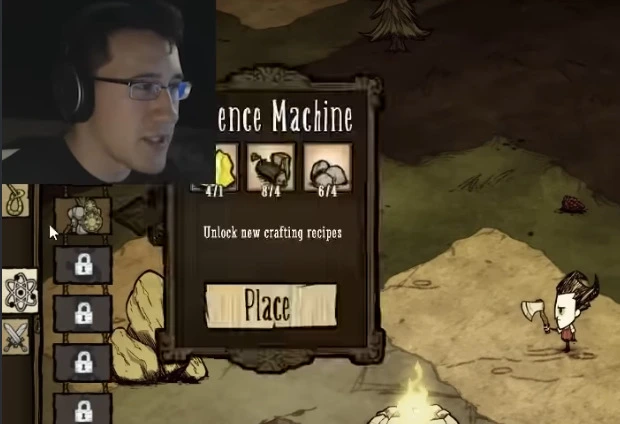 Early in the game I have to collect rocks and sticks and gold (IIRC) to make a “science machine” (WTF is that?) as a requisite for further crafting.