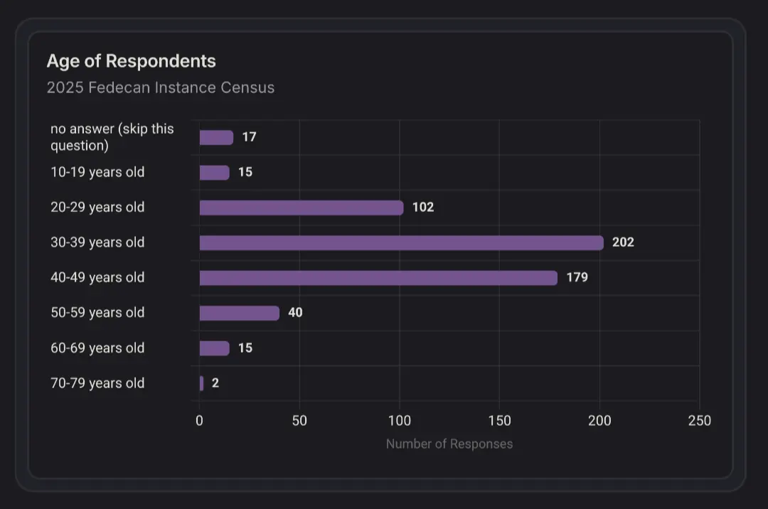 You know this is a chart of the ages most likely to participate in a survey not necessarily a representation of the avg age of users, right? Especially depending on how many days the survey ran for because Lemmy is far less likely to see daily user activity than a facebook/reddit/twitter. Its just not big enough to generate enough content to fill daily use needs. Not talking shit just reflecting on what ive seen thru daily active user reports and content volume.