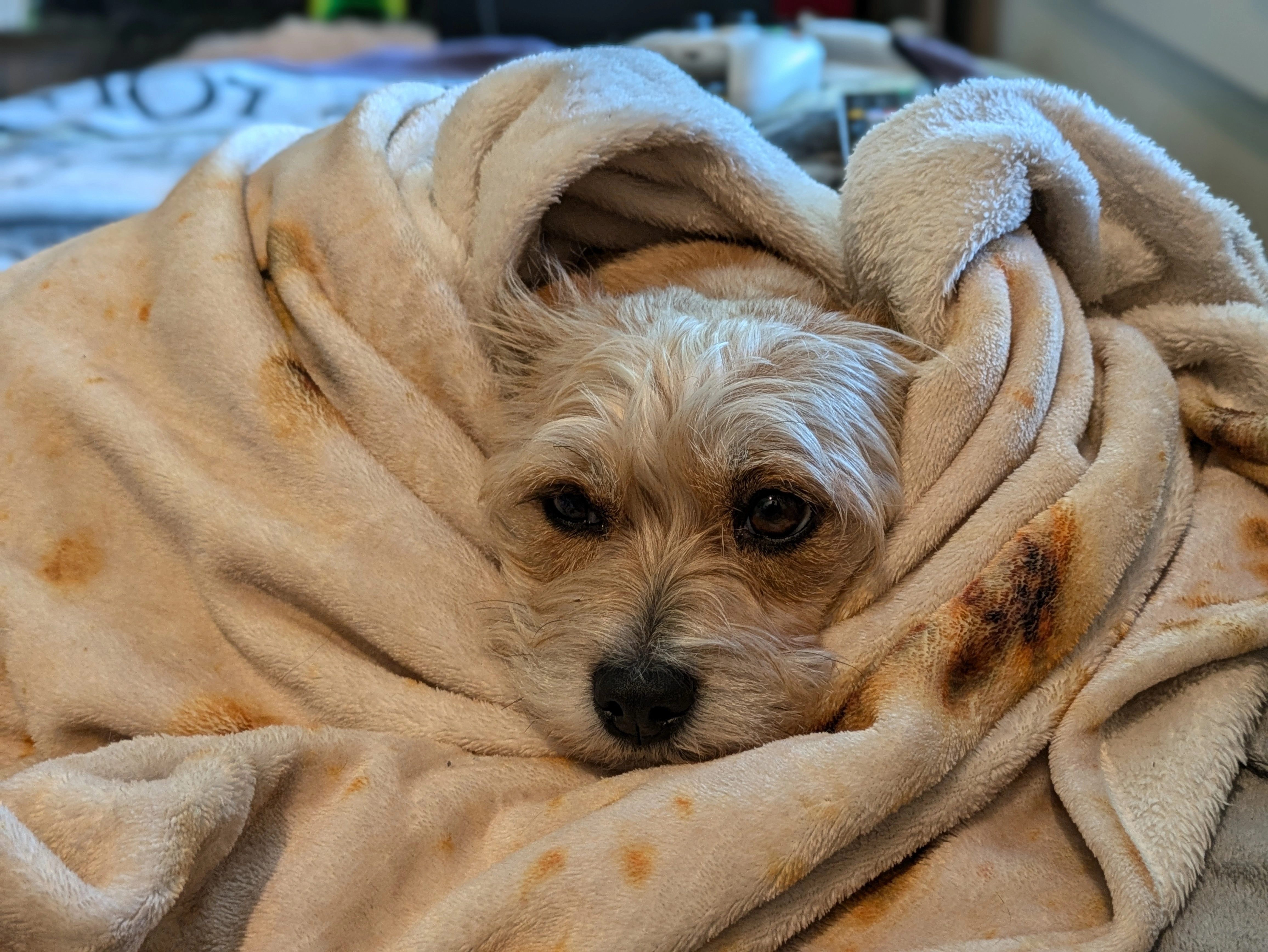 No joke, when I saw the thumbnail I was just about to go looking through my photos because my dog looks very similar (terrier Chihuahua mix so his snout is a little longer) and he loves wrapping up in my tortilla pattern blanket.