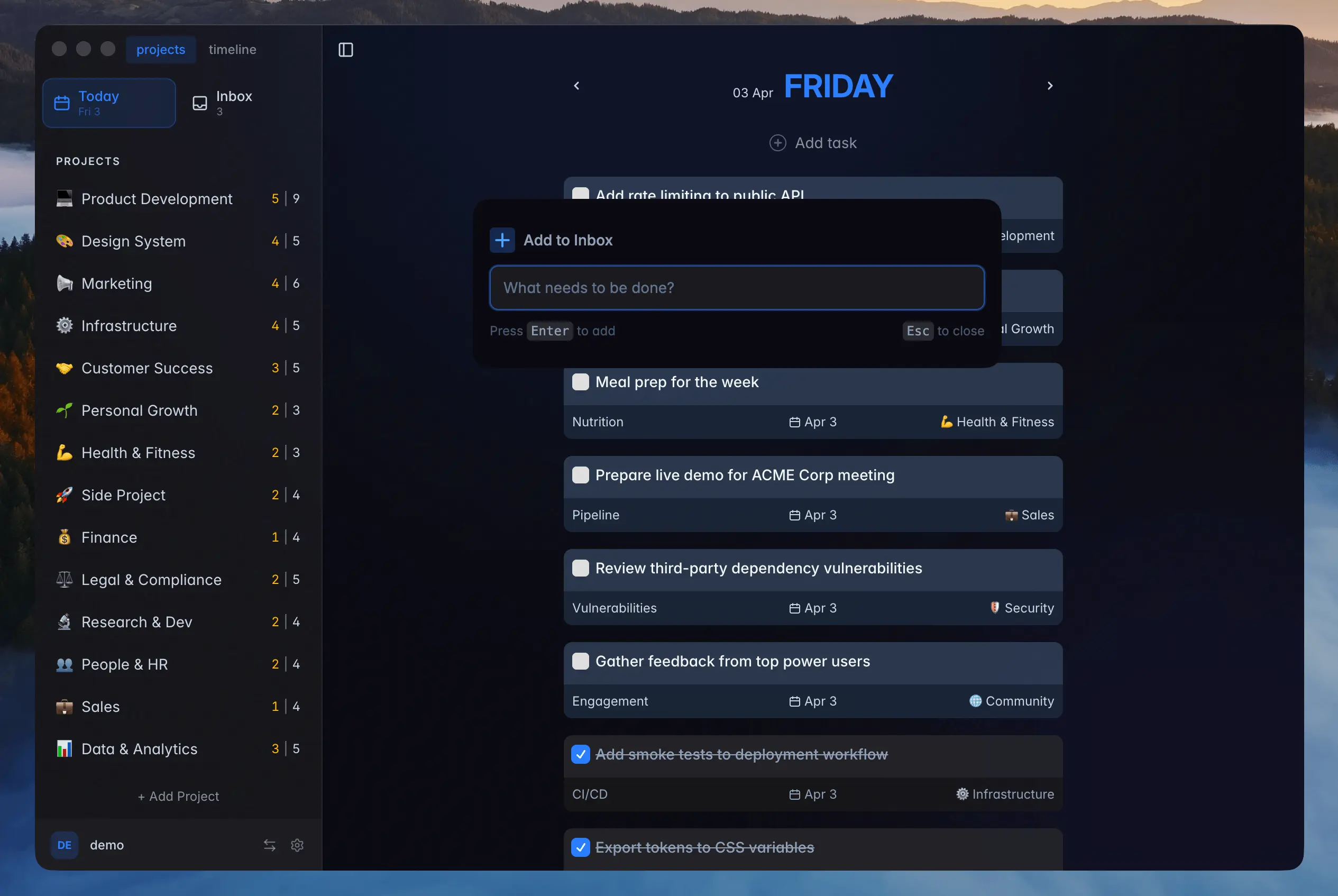 Also, one of the top feature that I really wanted is global quick add shortcut. You can trigger it with cmd+shift+a on macos, ctrl+shift+a on windows/linux.