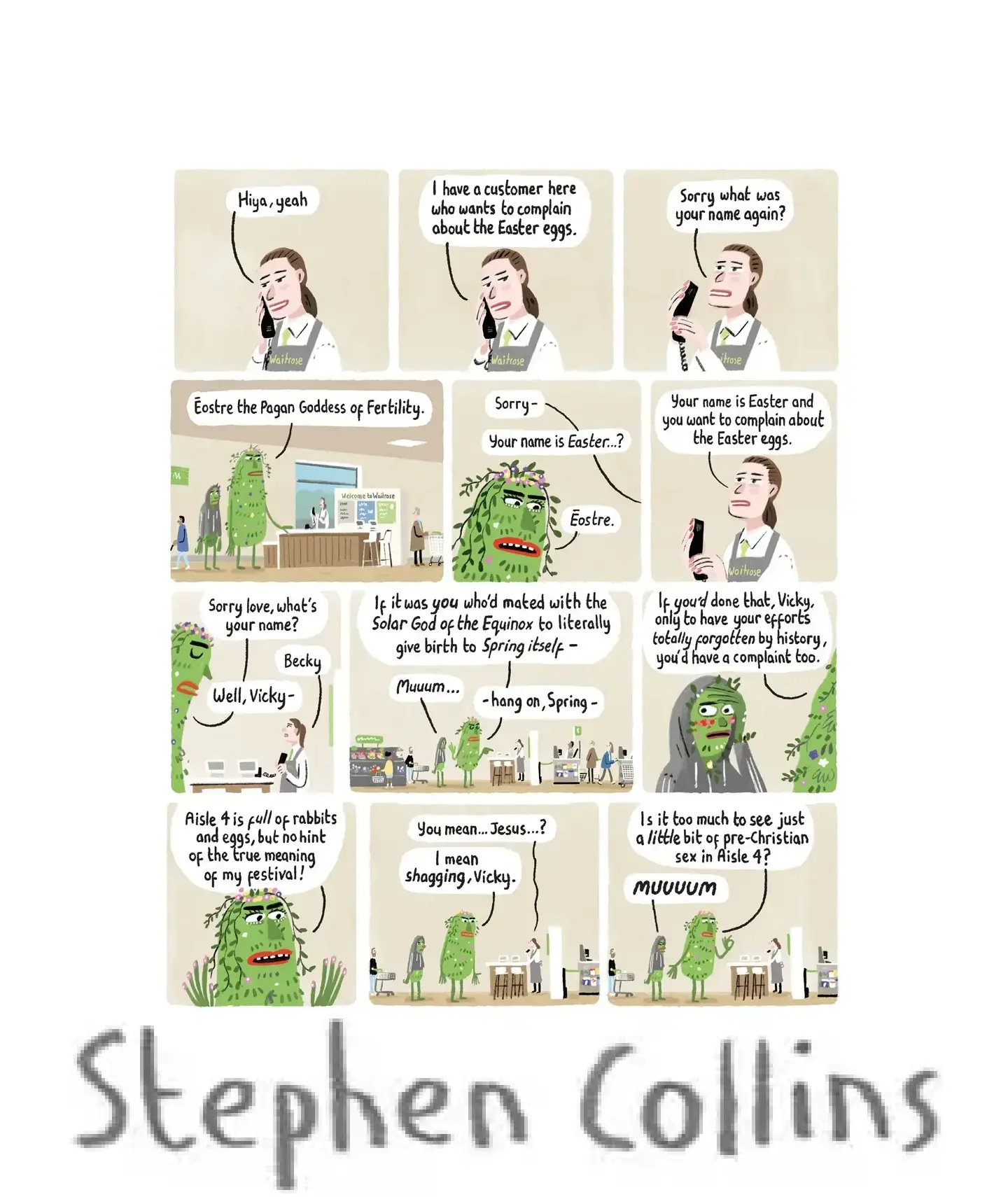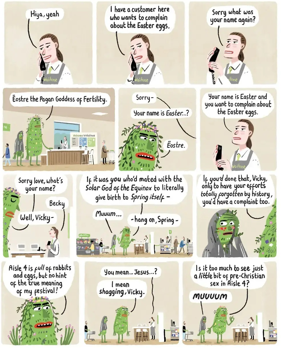 4 [Pull back to show the customer is a very tall, green-skinned, PAGAN GODDESS, festooned with flowers. Stood next to her is her son, a normal human teenager in a hoodie, who looks mortified by his mum.]