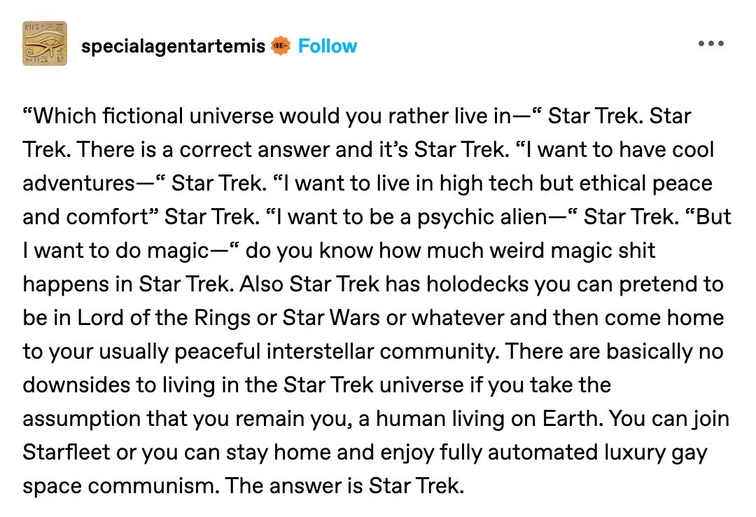 One thing they never really get into in Star Trek is how the body modification scene evolved in a future with medical replicators and “Doc will shine a light on it” levels of medical technology. I’m sure they could easily perform a gender transition, including changing reproductive organs to whatever combo a person wanted, in an afternoon, to say nothing of the possibility of cosmetic and functional structural changes. We see them perform highly complex and detailed biological modifications so crew members can pass as aliens like it’s nothing, so why not make people taller/shorter, wider/narrower hips, bigger/smaller boobs, more feminine/masculine face, horns, pointed or alien ears, new sense organs, extra arms, etc. What kind of wild piercings are people getting? What new methods and styles of tattoos have they come up with? The possibilities are incredible. That would be a fun world to explore, even within the Federation’s taboo against genetic alteration.