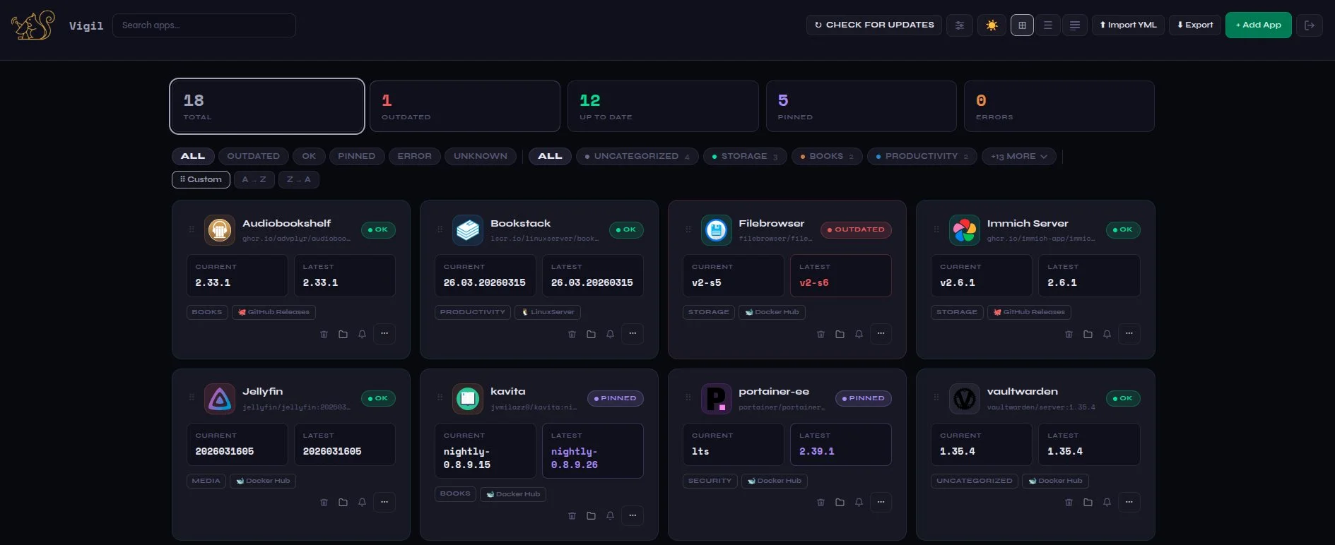 I’ve noticed that many people with home labs prefer to update their applications manually instead of relying on other apps that automate the process. Often, they have to check each one individually. That’s where Vigil comes in. The primary function of Vigil is to centralize the information and give users clear visibility of which applications are outdated, their current version, and the newer version available from several sources. This way, you can decide what and when to update.