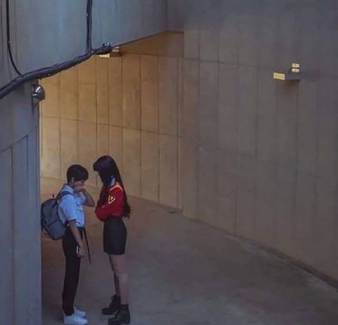 Shinji’s personal crisis comes at the worst time as he is at this point the only person on earth left able to pilot one of the robots and save humanity from a threat that is actively at play while at the same time the facility they’re in which operates these robots is under an active assault by a specific faction of people sweeping the complex murdering everyone. In the lead up to the moment portrayed in this image Misato is trying to escort Shinji to the hangar in a last ditched effort to save him so he can pilot his robot before it’s too late. The scene is kinda fucked up because in trying to snap Shinji out of his breakdown Misato kisses him and says “we’ll do the rest later”, but she’s like 28 and he’s 14. The frame they’re recreating in this shot is a few seconds before that kiss.