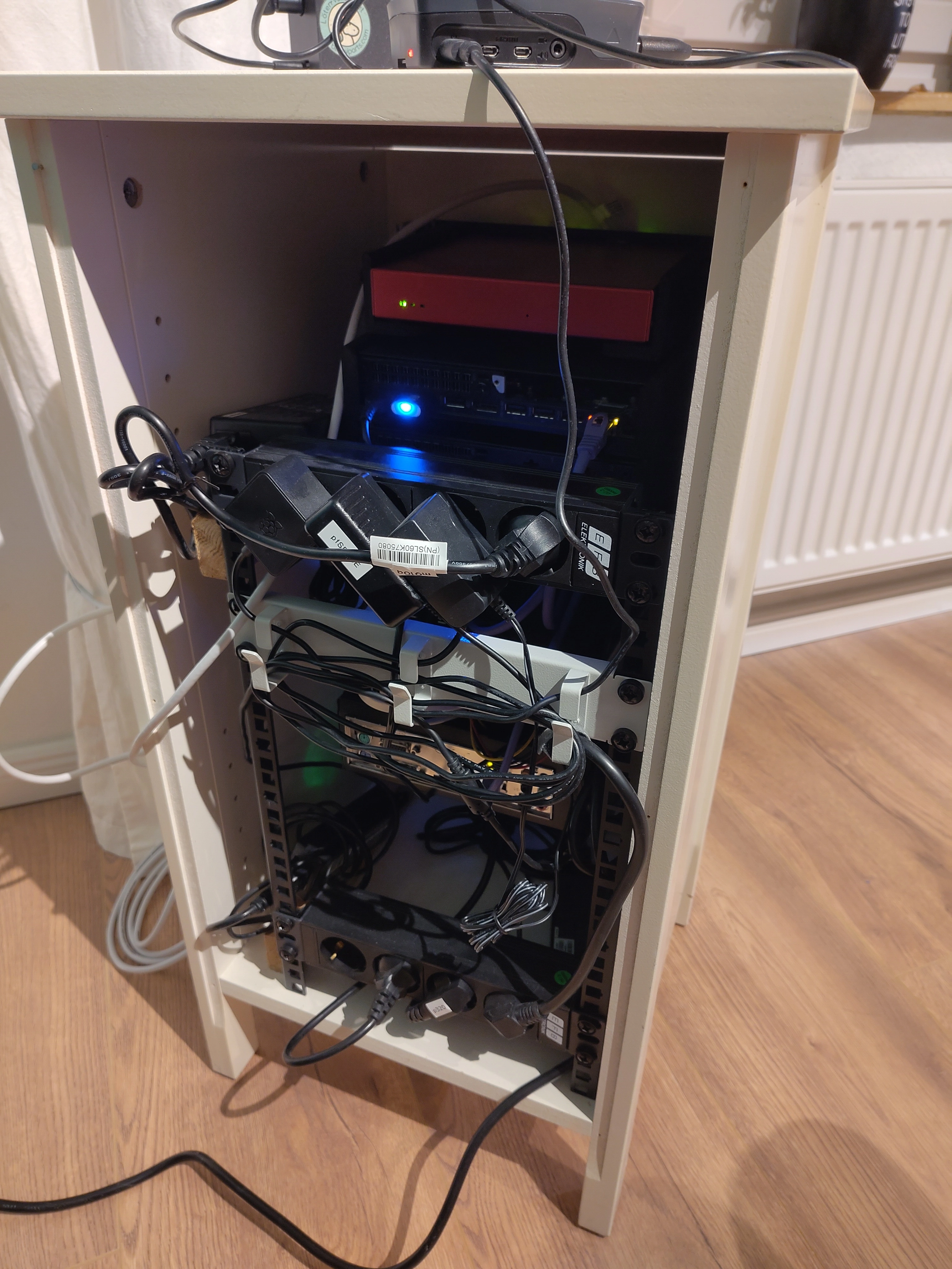 I used to have a random server box. This past year my hobby has been CAD work and 3D printing to turn a bunch of mini PCs into a fully remote controlled cluster, complete with a DIY IPMI KVM and custom built outlets that are controllable for power cycling (hard wired, not radio smart outlets). It’s all self-contained with a single plug to the UPS.