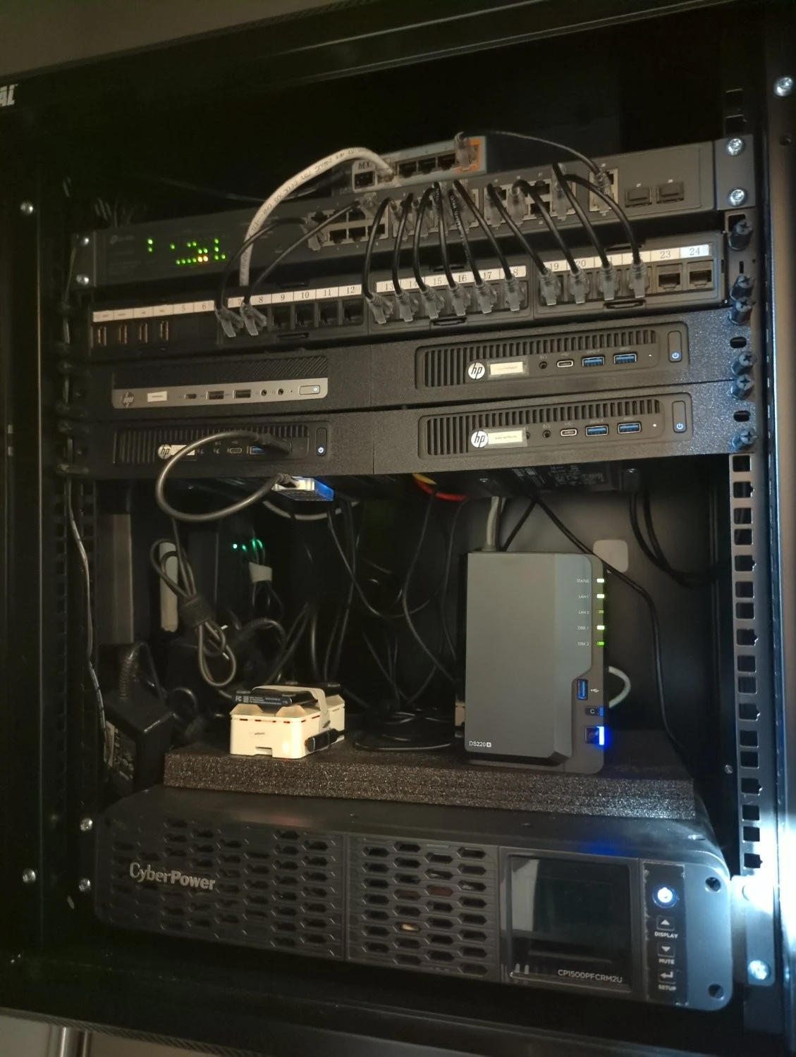 And that one random device on top is the router. Maybe one day I’ll upgrade to a better one, but this one handles everything great. Its just too small to be worth mounting. Kinda like the Pi sitting on the UPS.