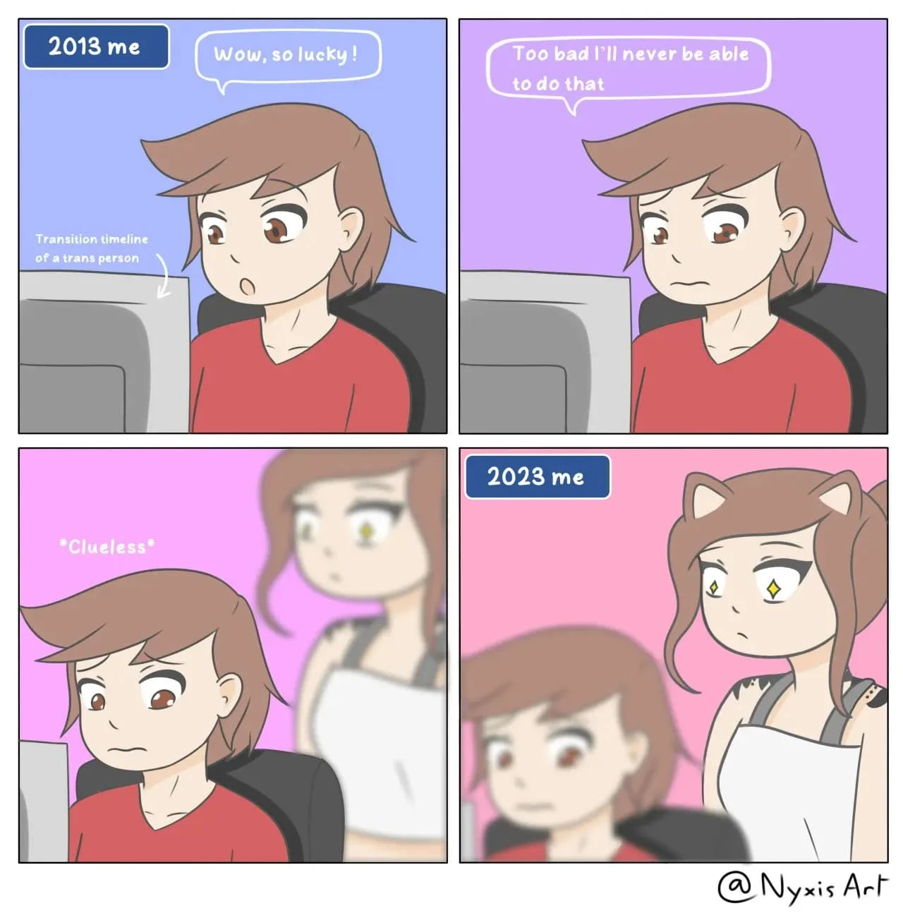Early on in adolescence I started “accepting” that I wasn’t afab and learned to suppress my feelings, to keep my fantasies in my dreams. I’ve actually asked myself several times throughout my life if I should consider a “transsexual transition”, but my archaic understanding of the concepts made the whole thing appear scarier than it is. “What’s to gain if I don’t even hate myself”?