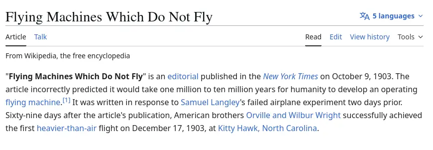 Similarly, the NYT predicted in 1903 that it would take “one million to ten million years for humanity to develop an operating flying machine” (airplane). The wright brothers achieved the first powered airplane flight sixty-nine days later. Link: https://en.wikipedia.org/wiki/Flying_Machines_Which_Do_Not_Fly