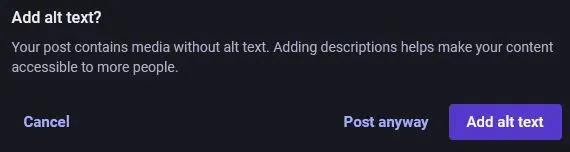 Alt text: "Screenshot of the warning you get with the warning for missing alt enabled. “Add alt text? Your post contains media without alt text. Adding descriptions helps make your content accessible to more people.” Below it are 3 buttons “Cancel” “Post anyway” and “Add alt text”