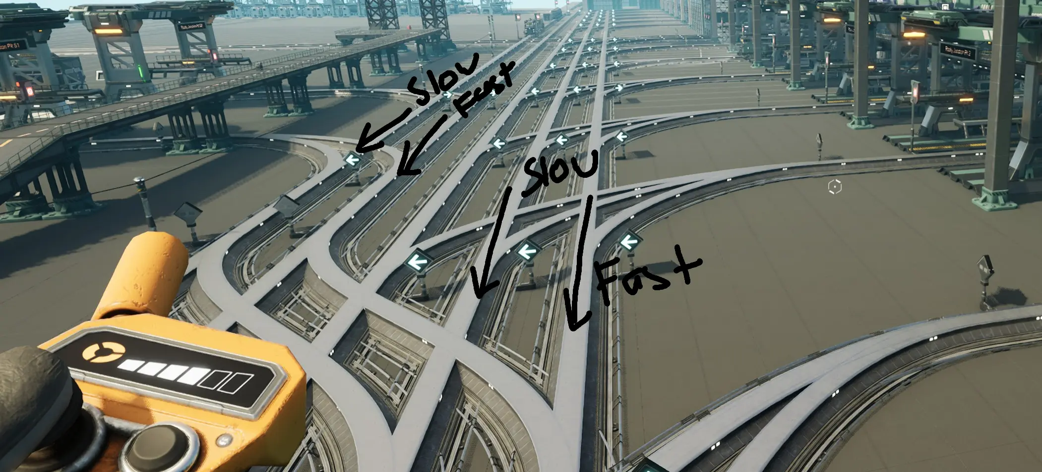 I don’t. So this question has come up a few times, if I have 4 tracks how do I prioritize trains on separate tracks? The answer is I don’t really. What I do is when I build a station out in the middle of no where I make a concious decision on which of the 4 tracks I want to hook it up to. Do I want it on the fast line or the slow line? That will determine the train’s path for the entire route, if it takes the inner or outer lines. Because of this, the fast and slow tracks never connect. Once a train is on the fast or slow track, that’s it’s path. The only place where these two parallel tracks meet is at the Hub, where each station branches to both the fast and the slow tracks. That just makes it easier for me to keep building in the field. If you can decipher it, this is how my Hub is laid out:
