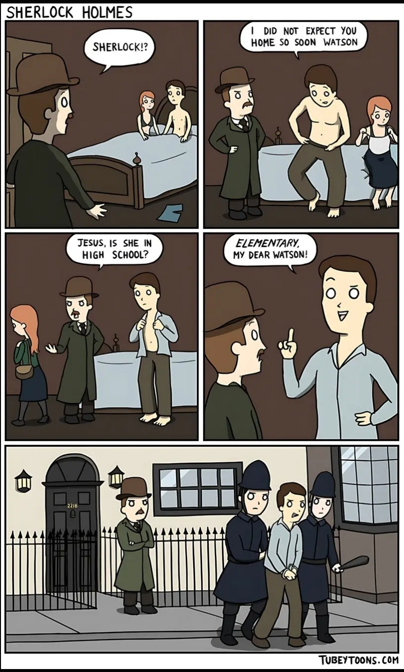 Yeah idk. There is a Sherlock Holmes show called “Elementary” but that doesnt really make any sense here. Weird comic.
