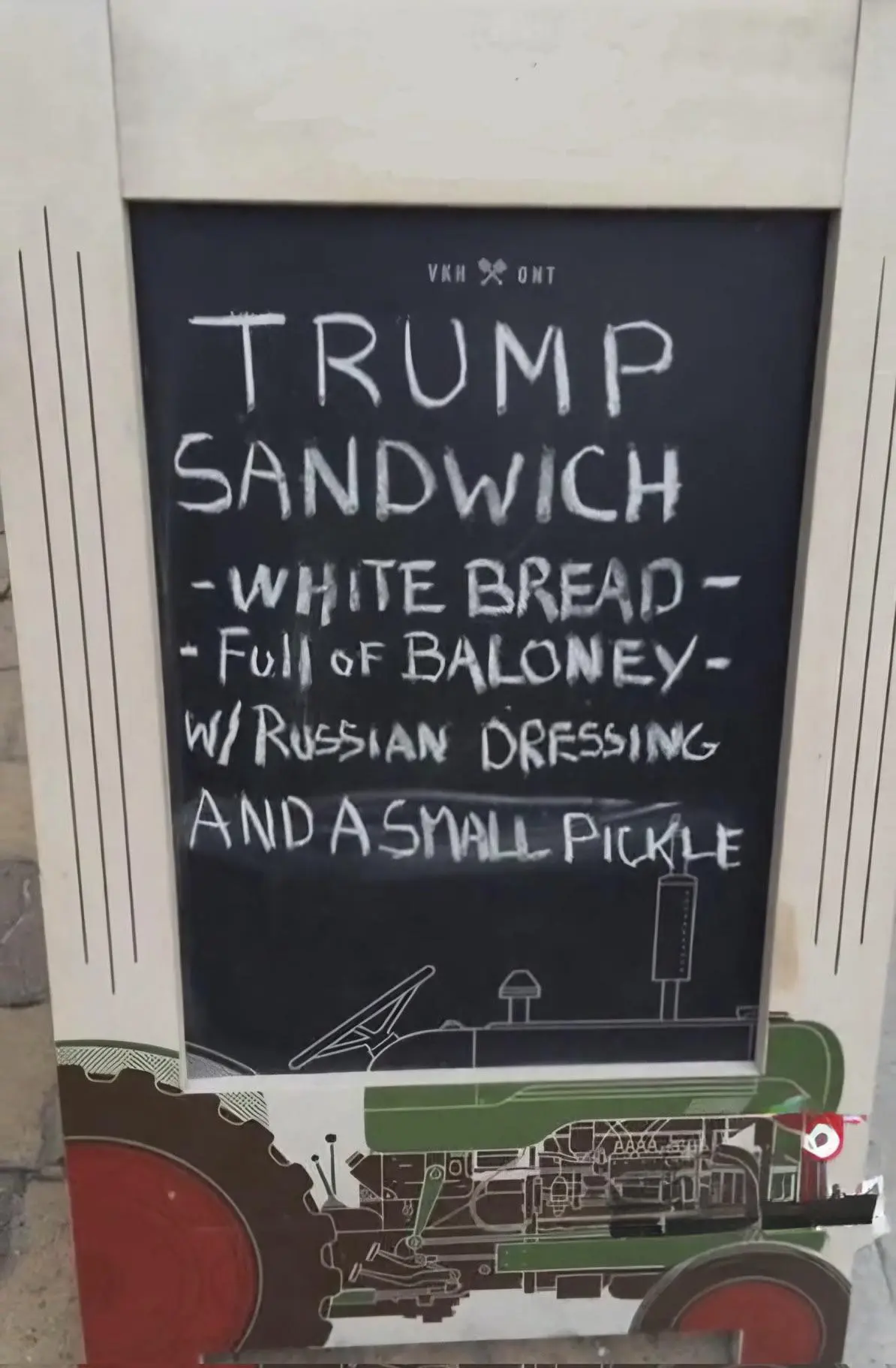 “Now this—this is the greatest sandwich ever created. We’re talking historic. It’s got the best balloney—the best, not that fake deli junk—they say it’s 100% truth meat, just like me. The Russian dressing? It’s strong, it’s bold, it respects strength. Putin himself said, ‘Donald, this dressing is beautiful.’ And the pickle—tiny, yes, but it gets the job done. Tremendous flavor, very efficient. Some people are even saying it’s a perfect sandwich—maybe even the most masculine sandwich of all time. Crooked media won’t admit it, but they’re eating it too, behind closed doors. Everybody wants a bite of the Trump Sandwich. It wins. It just wins.”