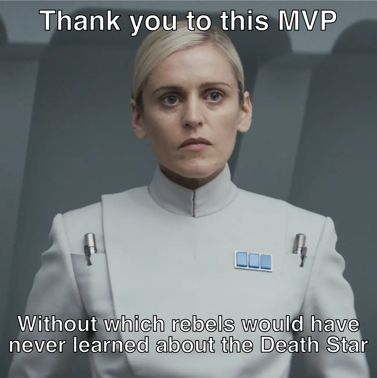 Tuxman@sh.itjust.works to Star Wars Memes@lemmy.worldEnglish · 8 months ago[Andor Spoiler] Where's HER medal at the end of A New Hope?NSFWimagemessage-square7linkfedilinkarrow-up133arrow-down11