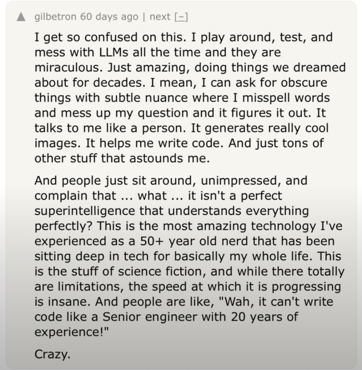 This guy’s argument is that he’s a 10xer because he’s using AI effectively, i.e. just proofreading its output and deleting the comments. (Also, why hire juniors when you can get the same work for $20/mo?)