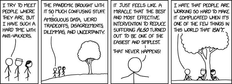 Cueball: It just feels like a miracle that the best and most effective intervention to reduce suffering also turned out to be one of the easiest and simplest.