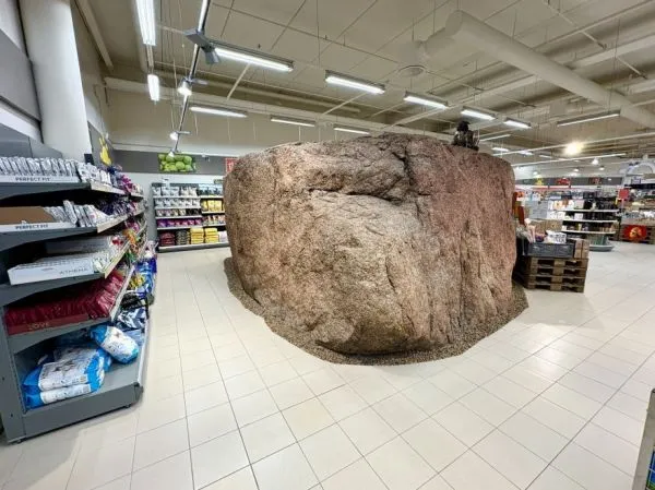 Estonian gentleman Illimar Lepik Von Wirén tweets that a grocery store was built around a glacial boulder. This is a grocery store that is part of the Viimsi Shopping Center in the town of Haabneeme. Another photo of the rock suggests that it provides a space for a shopping cart-shaped sculpture.Estonia has many "erratic boulders" left over from previous ice ages. They have government protection.Photo: Nordecon...