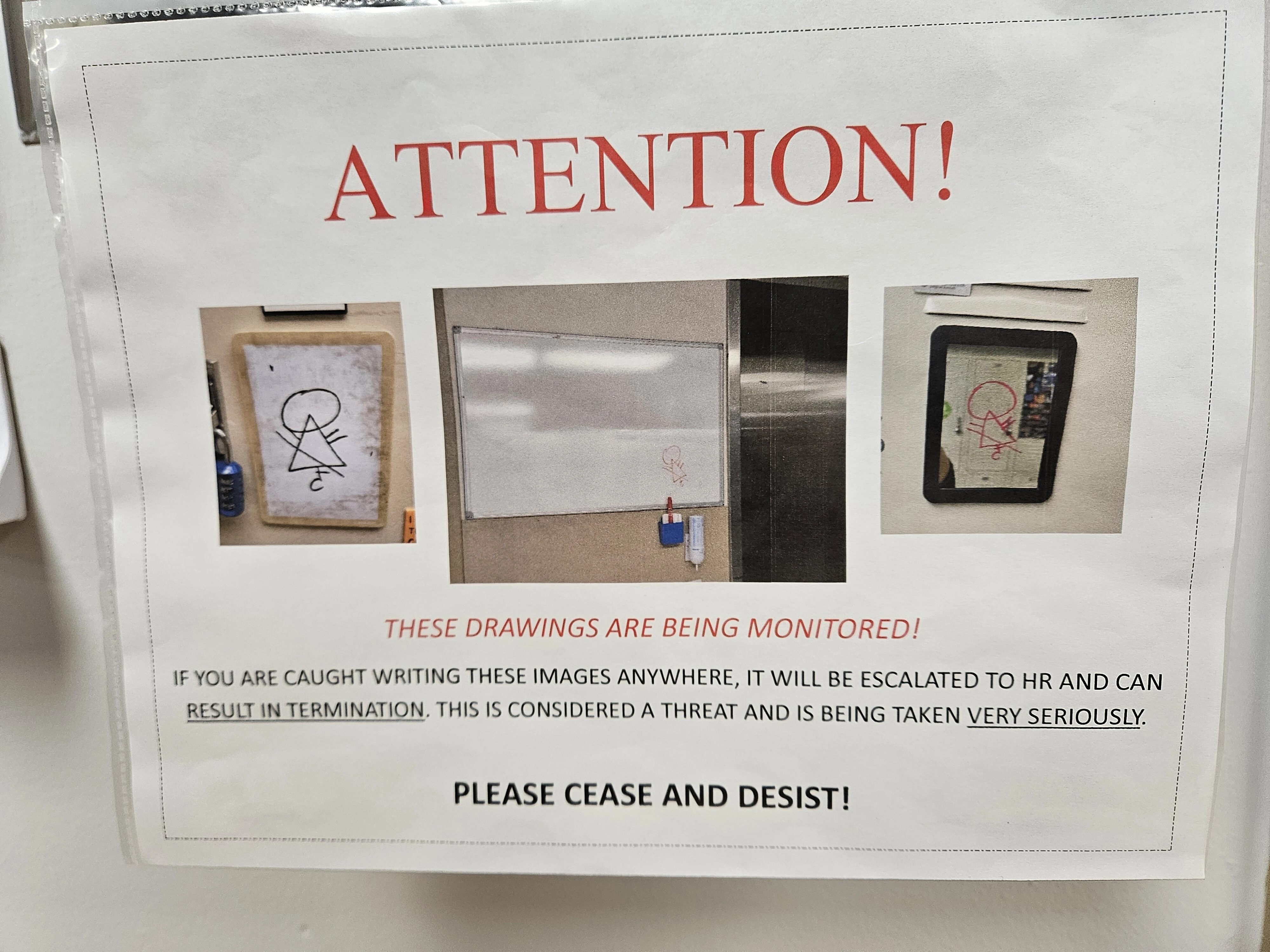 This was posted under the punch clock at work. I assume it’s some kind of occult symbol but that’s just a guess. Anyone know what it is or what it means?
