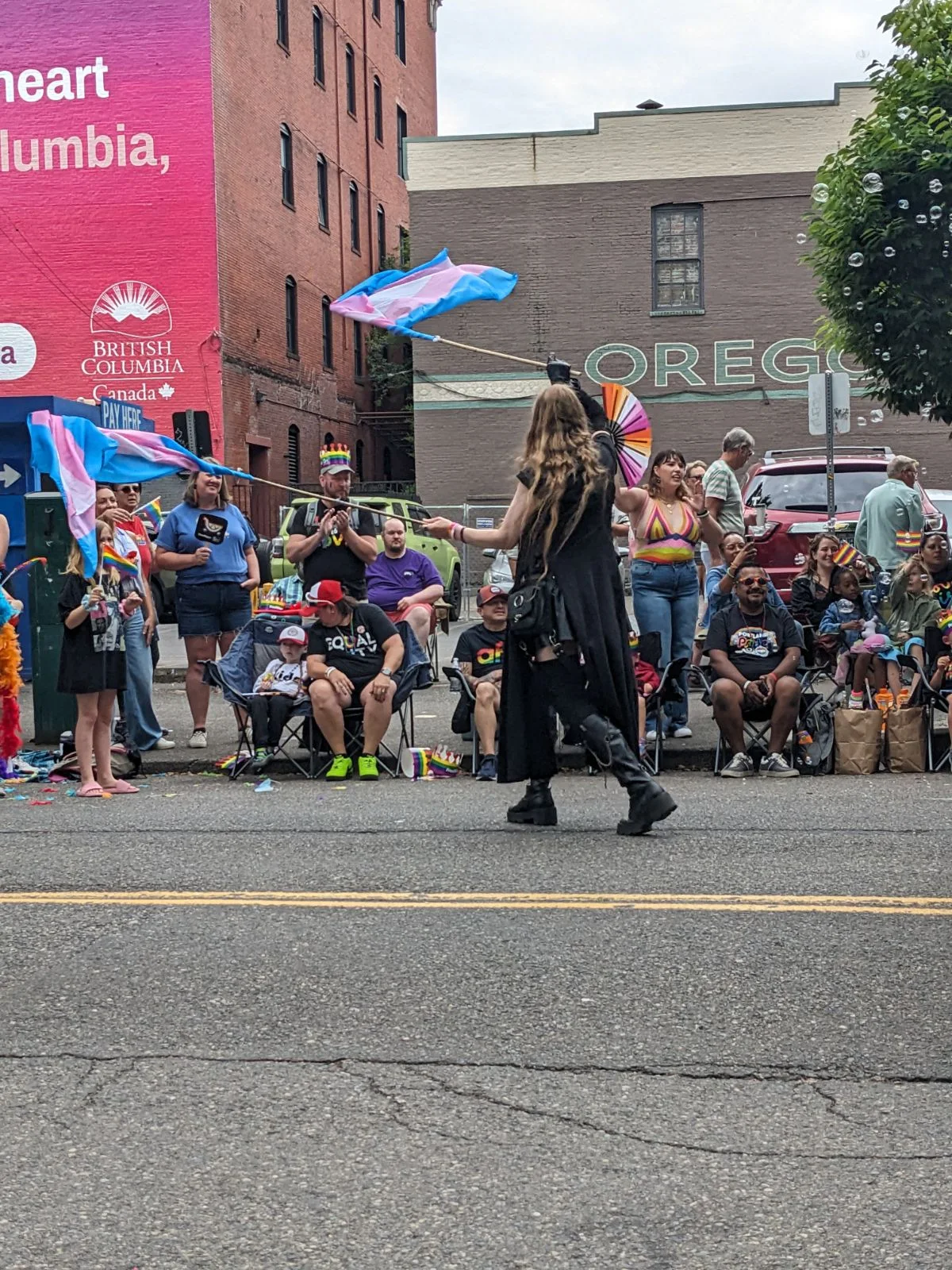 I had led my employer’s regiment for the Portland Pride Parade, and was out front flourishing two gigantic trans flags while wearing an outfit that could have been in any Final Fantasy game. I was on a lot of news for that. Hefting those giant flags about and doing tricks with them at any trans person and reporter I could see, eventually covered my left hand with welts and made me horribly sweaty in a very expensive outfit.