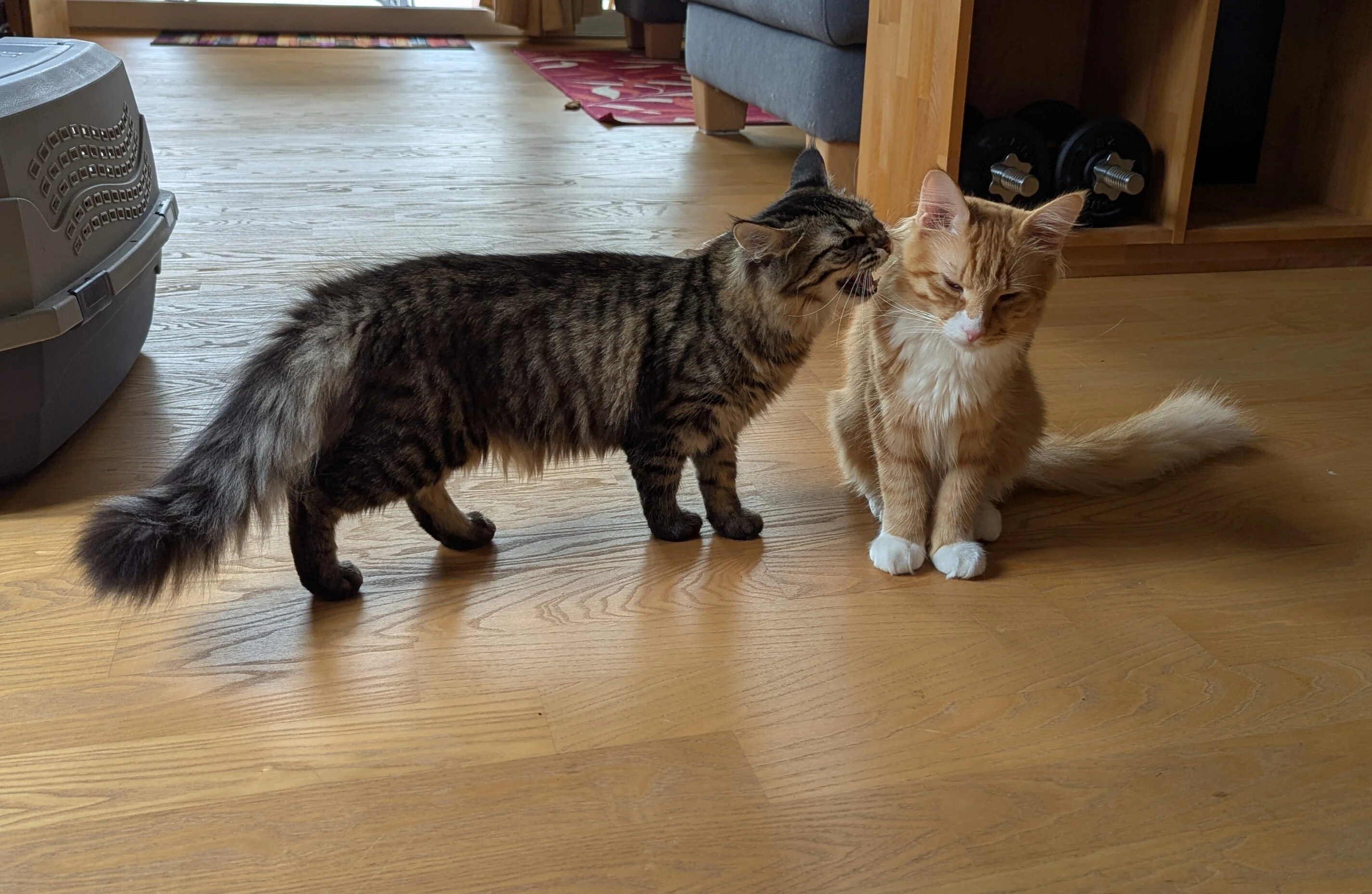 Campari was neutered today. Sake didn’t like how he smelled after the visit to the vet and was hissing at him while he was still groggy from the anesthesia.