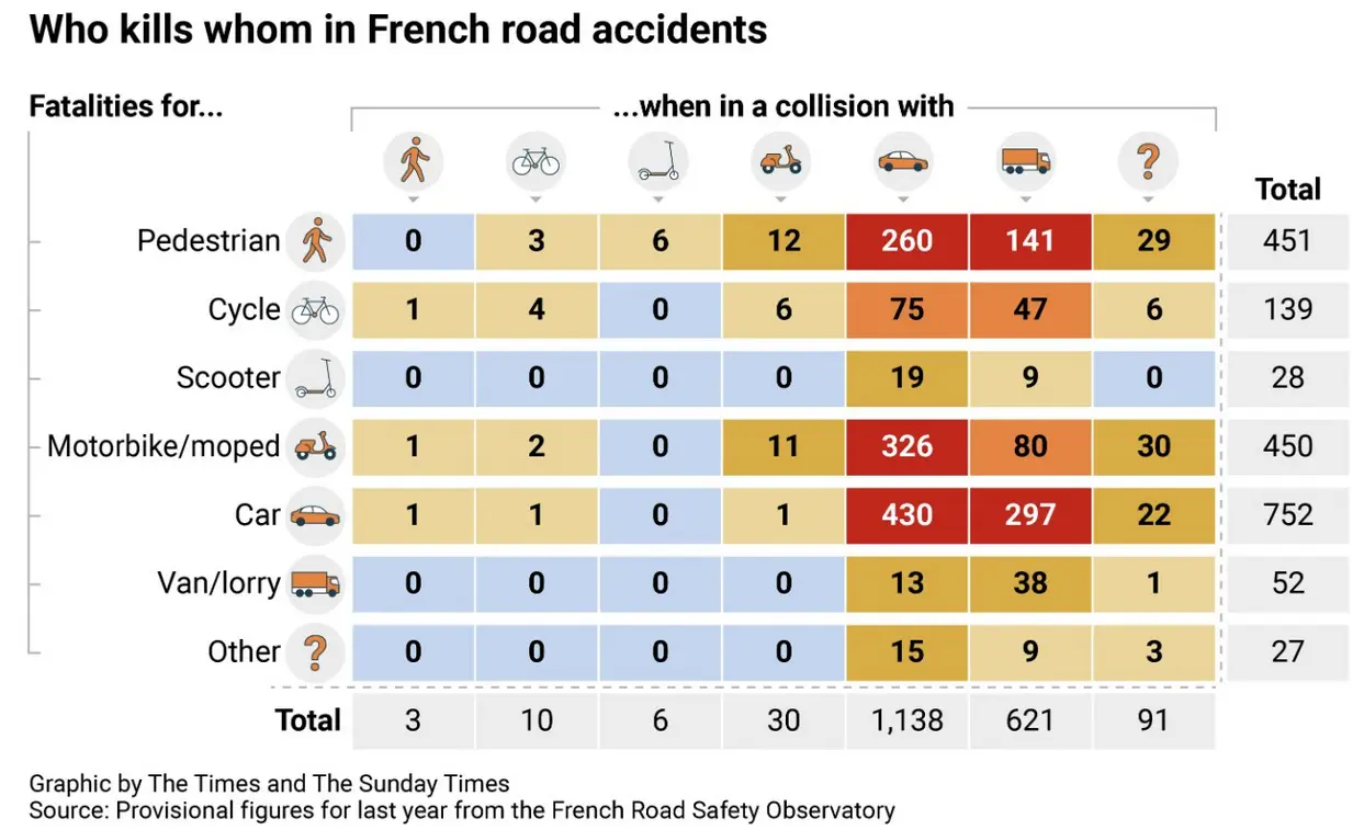 Initially, I see that and think trucks are less deadly than cars, but according to my brief Google search (https://www.statistiques.developpement-durable.gouv.fr/donnees-sur-le-parc-automobile-francais-au-1er-janvier-2024), there are 5x more cars than trucks, which puts them [trucks] over the top of cars in every category.