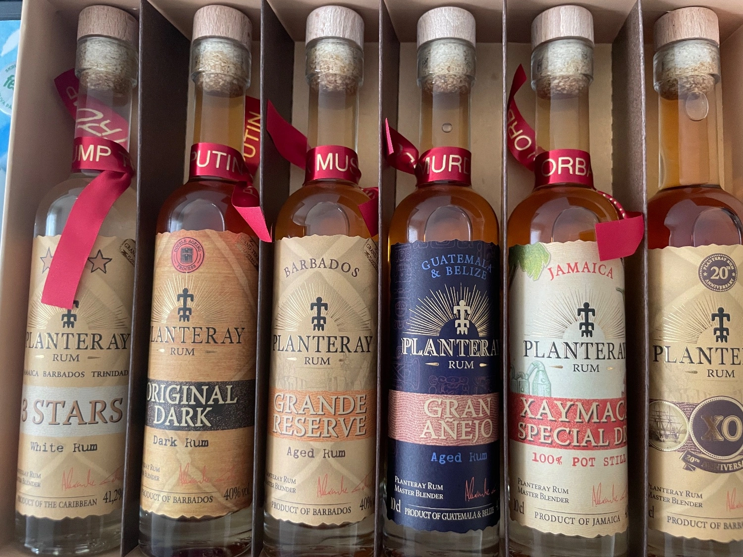 This is a Planteray tasting giftbox, six bottles of different rum, five of which are dedicated to a specific bad person, for when I no longer share the planet with them, I printed ribbons on my label maker with the name of the person the bottle is dedicated to.