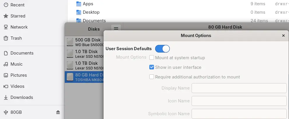 As for Linux, your user session defaults determine if it automounts or not. Mine USD set to automount, so you can see in this screen the 80gig drive was auto mounted, but you can turn off USD and use specific mount options.