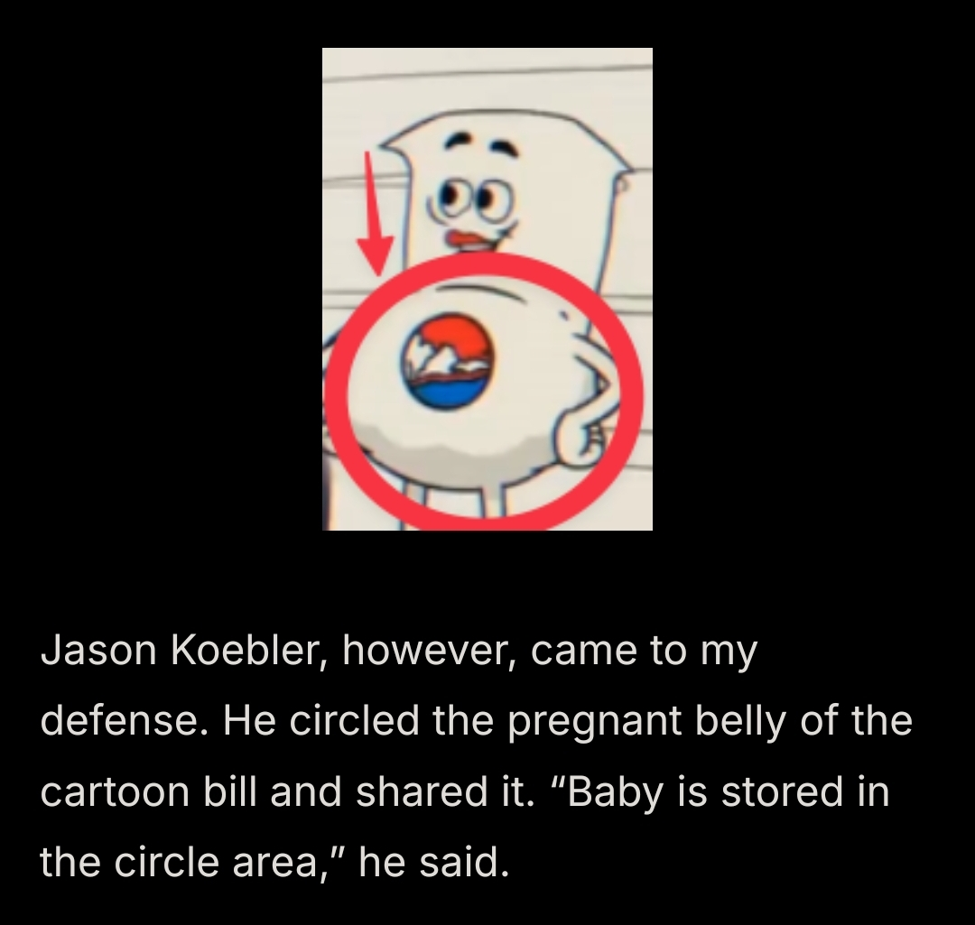 Jason Koebler, however, came to my defense. He circled the pregnant belly of the cartoon bill and shared it. “Baby is stored in the circle area,” he said.
