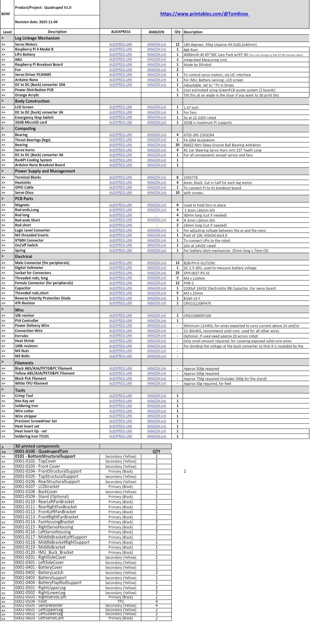 Looks small. Around 1.25kg of filament + 0.5kg for a stand. 12 servos, Rπ 4, Arduino. No link to software that I saw, and no real pictures of a verified print. Model was posted to thingiverse November 5th 2025.
