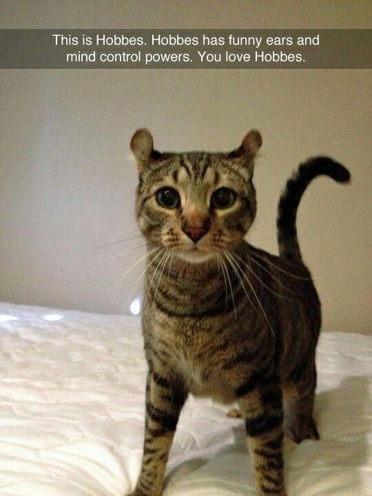 A picture of a tabby cat standing; his ears looks as if they’d been pinched together at the bottom. The caption reads “This is Hobbes. Hobbes has funny ears and mind control powers. You love Hobbes.”