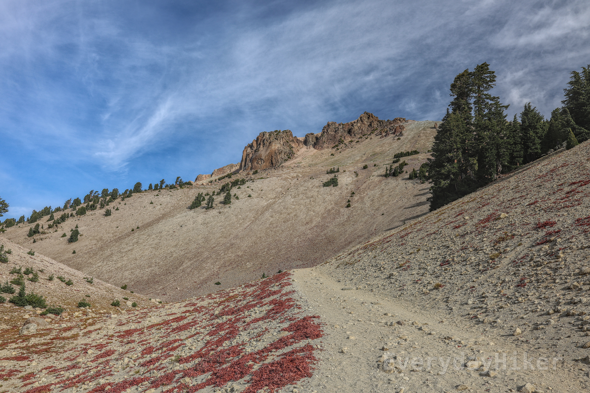 An early view up the trail when it is still ‘steep’ but before it gets ‘real steep.’ Intersecting lines of hillsides cross through the frame while red autumnal ground cover plants contrast with the evergreen trees and light desert brown of the mountain.