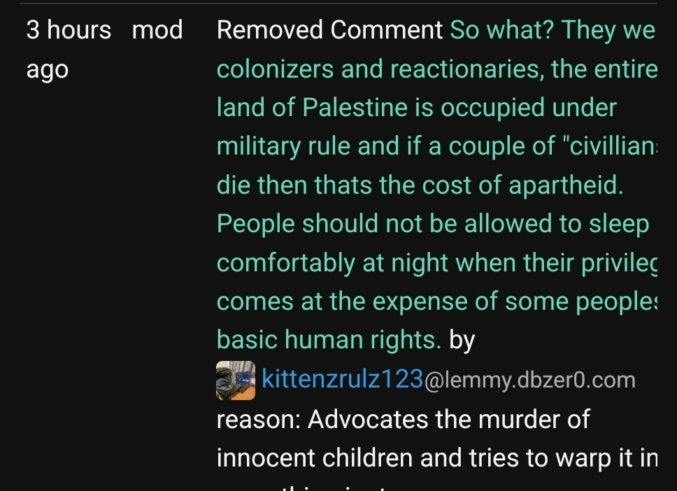 2 of the comments removed were for calling out someone being pro Palestinian genocide and explaining why it was bad what was happening in Gaza. Were those ones you removed cause not good look for who every removed them and not the cause