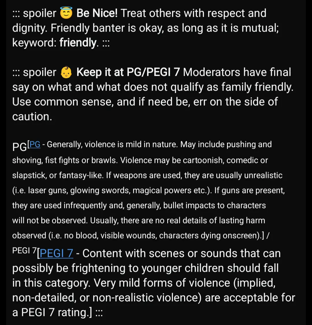 For the rules, could you use different formatting? A lot of users use mobile apps, and some of them don’t format markdown the way Lemmy does. The spoiler tag in particular doesn’t get rendered in a lot of them.